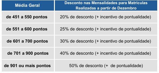 Os descontos são aplicados tanto na matrícula quanto nas mensalidades, conforme a média geral obtida no exame. Na matrícula, o percentual é de 40% para ingressos realizados em dezembro e janeiro, e de 35% para fevereiro.